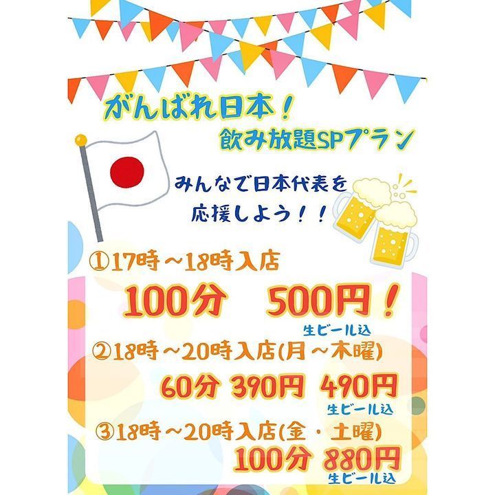 18時半〜は通常通りの飲み放題プランになります☺️